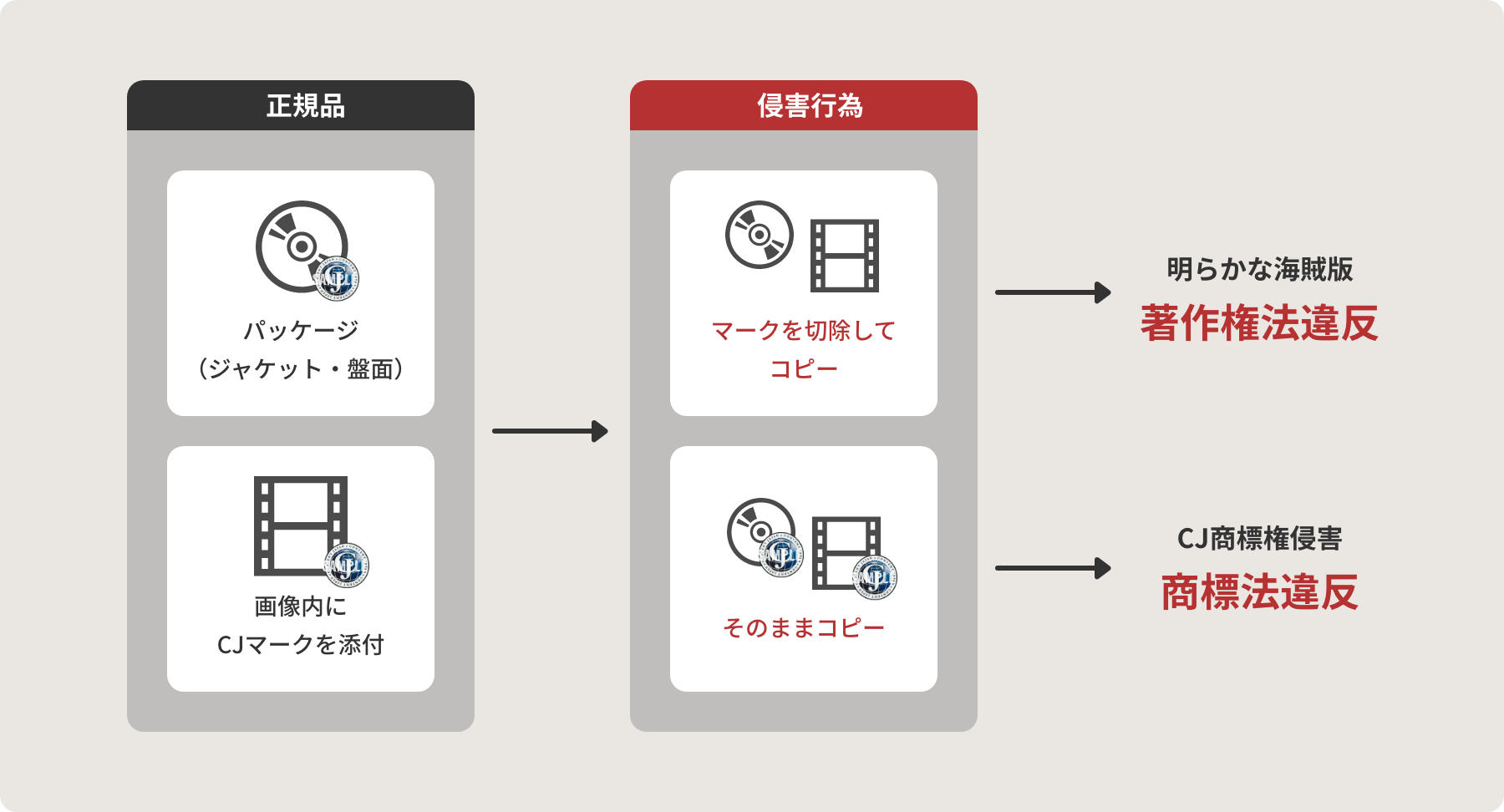 CJマークは、日本、米国、EU、中国、香港、台湾、韓国の7カ国・地域においてCODAの団体商標として登録されており、これらの国・地域でCJマークが付されたコンテンツの海賊版が流通した場合には、各コンテンツホルダーが持つ著作権に加え、CODAが持つ商標権を行使することで、より確実な侵害対策を実行することが可能になります。実際に、2008年から、香港においてCJマーク商標権の行使に基づいた海賊版の摘発が行われています。このCJマークは、CJ商標使用契約を締結しているCODA企業会員が利用できます。